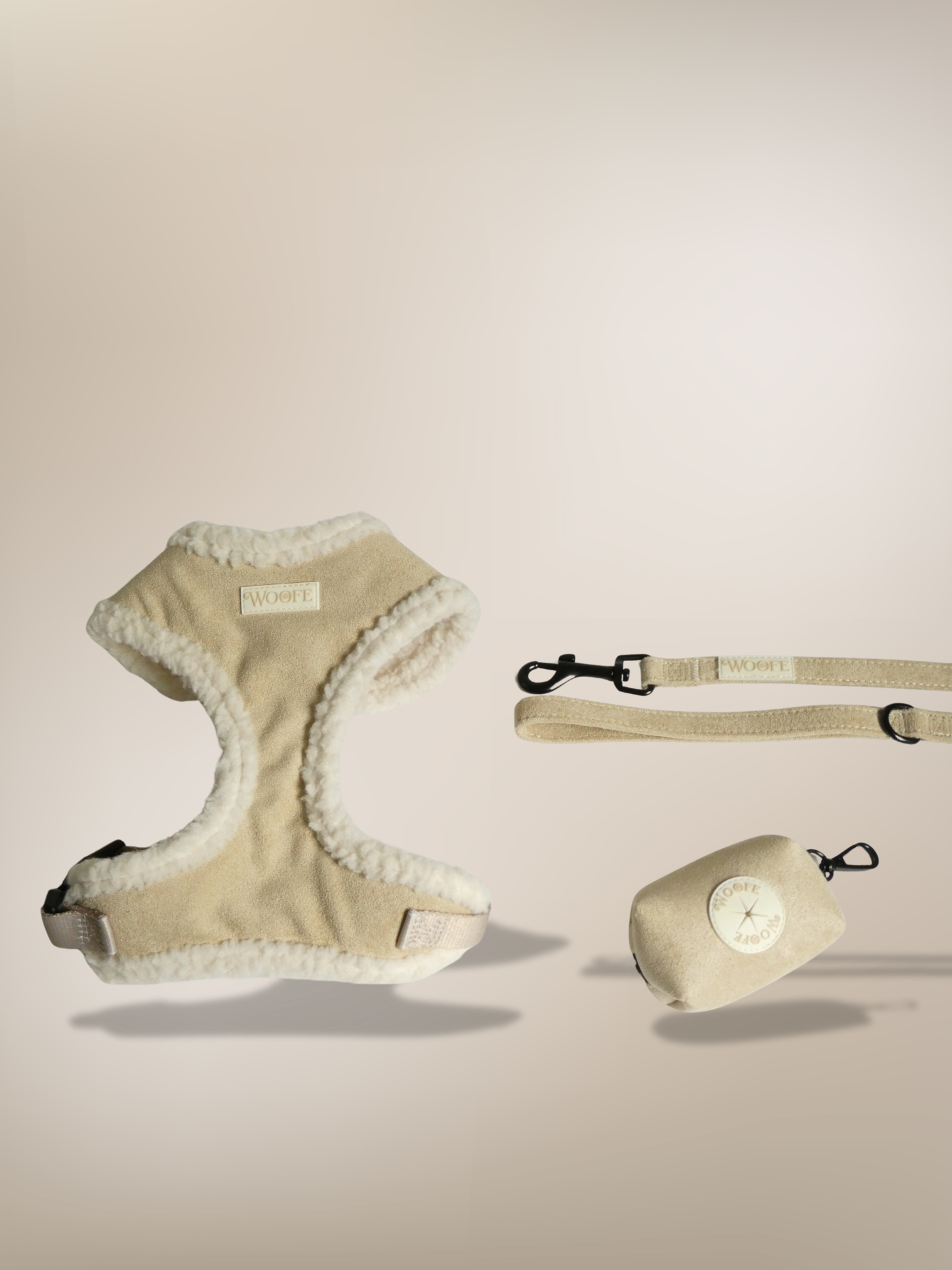 Beige Fur Harness & Leash with Free Waste Bag Holder