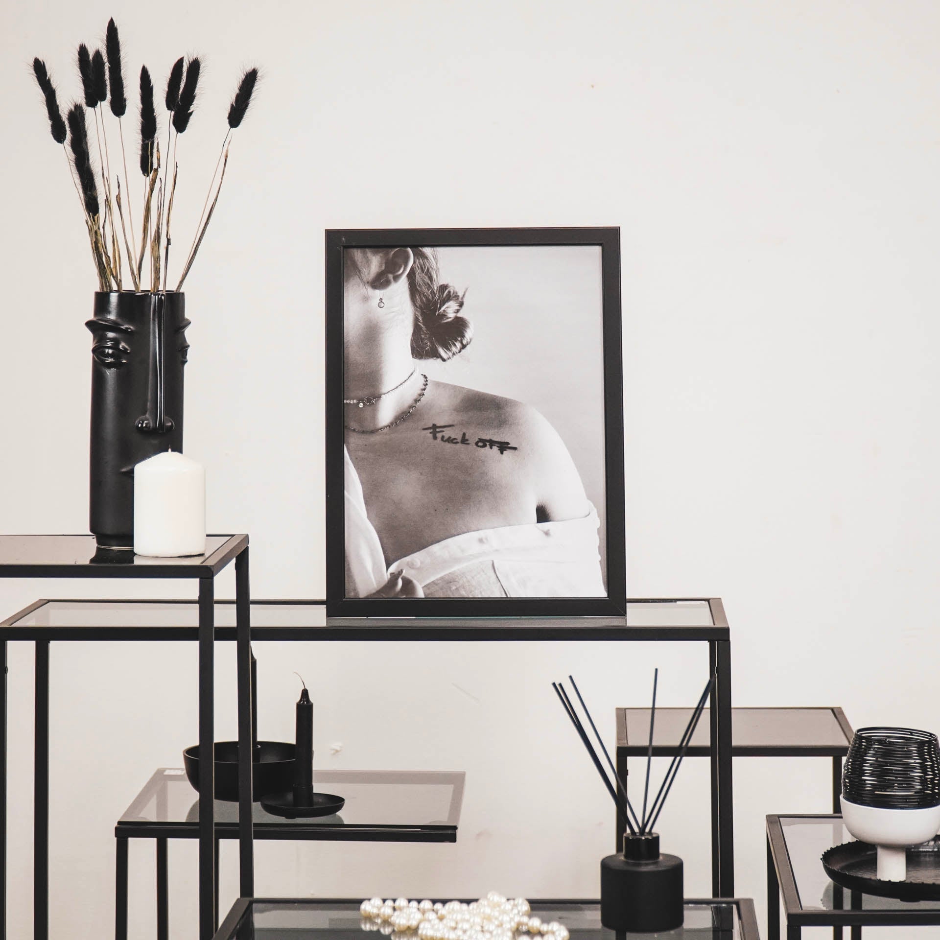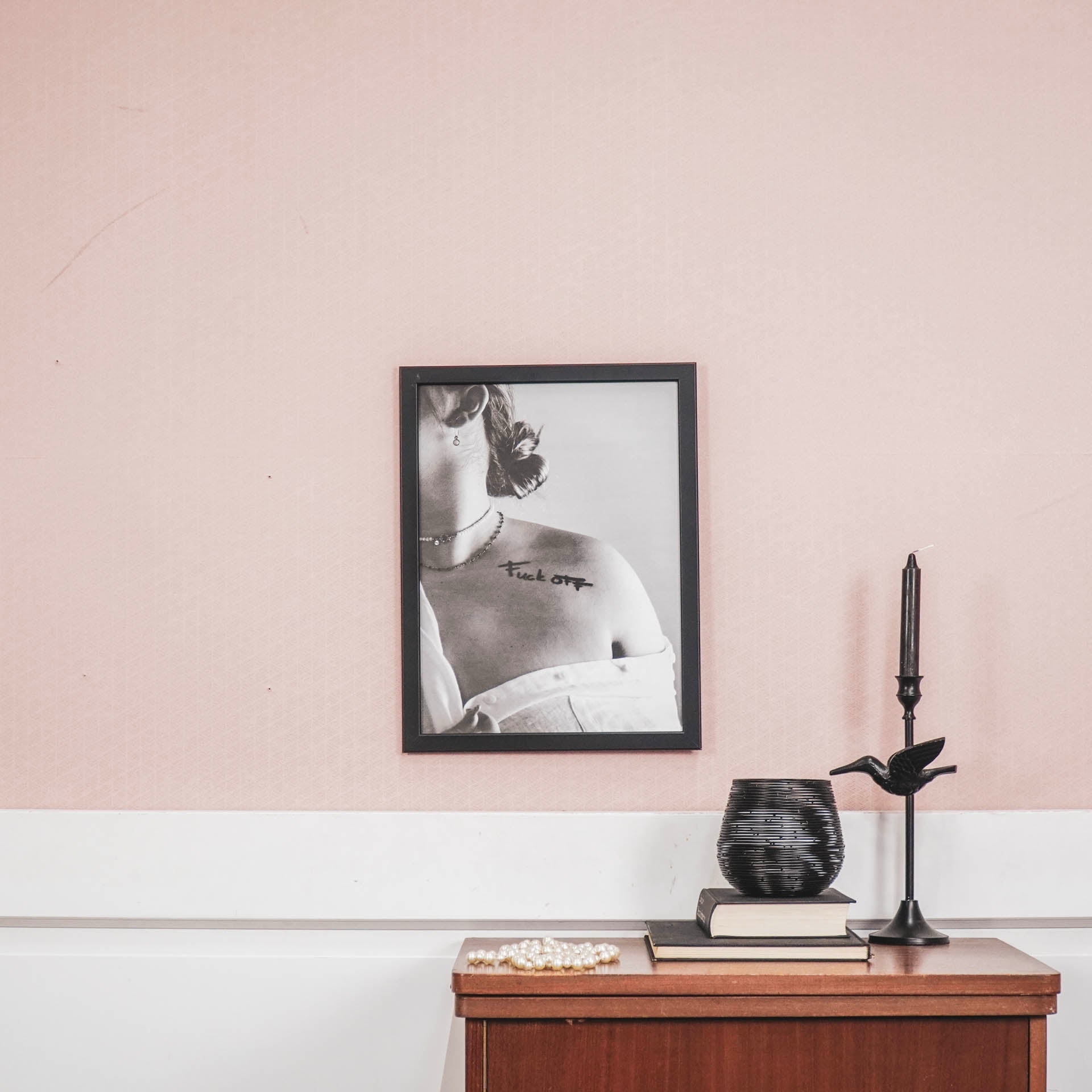 WALL ART - Met grote trots presenteren wij onze kunst posters. Zwart wit posters met kunst foto's en quotes. Op deze zwart wit foto poster wordt 'Fuck 'Off' op een stijlvolle manier gepresenteerd. Hoe sexy kan een schouder zijn? Waar zou jij deze fashion poster met quote ophangen?