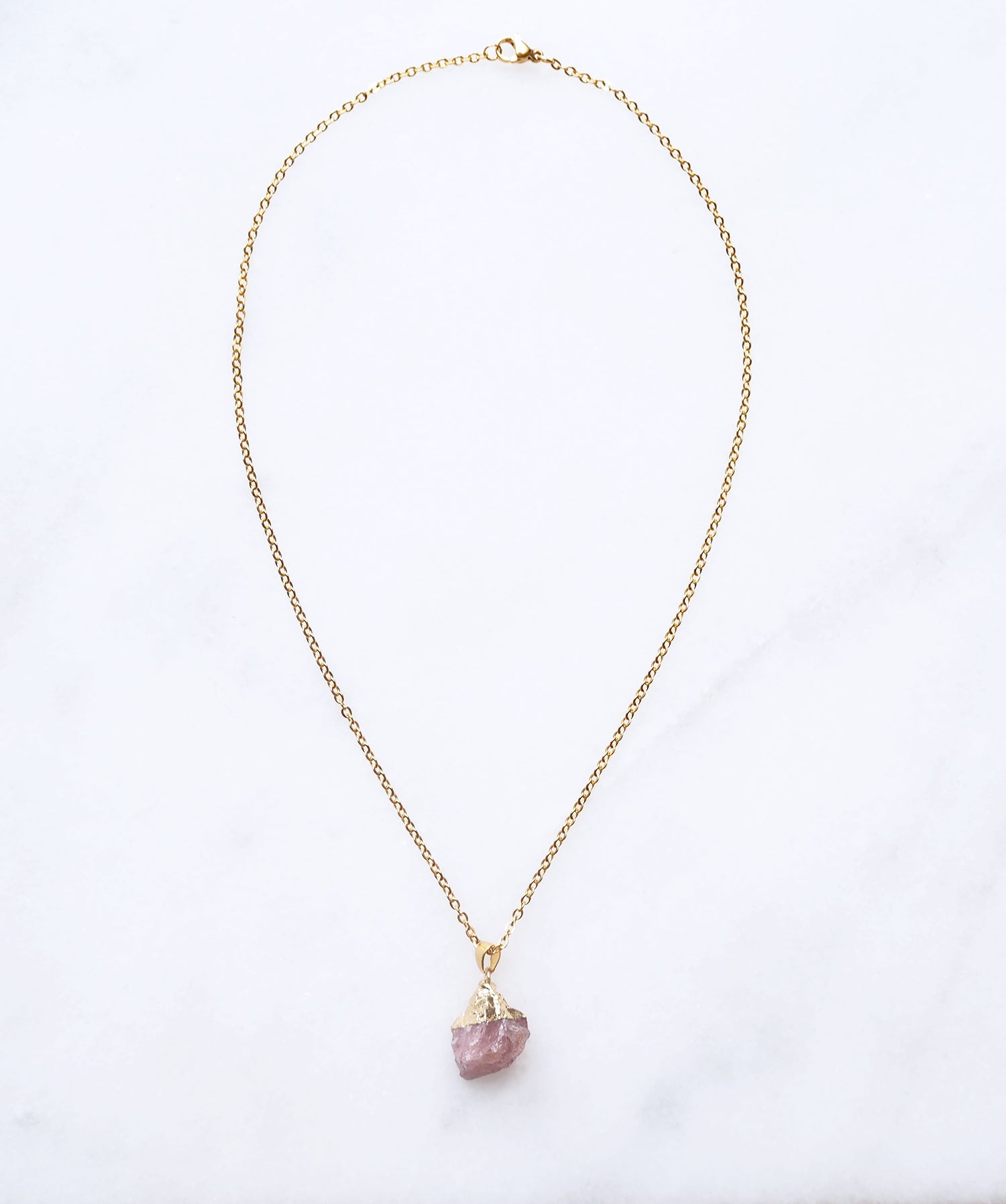 Gold-toned Stainless Steel chain or Champagne Satin cord featuring a Strawberry Quartz gemstone pendant.