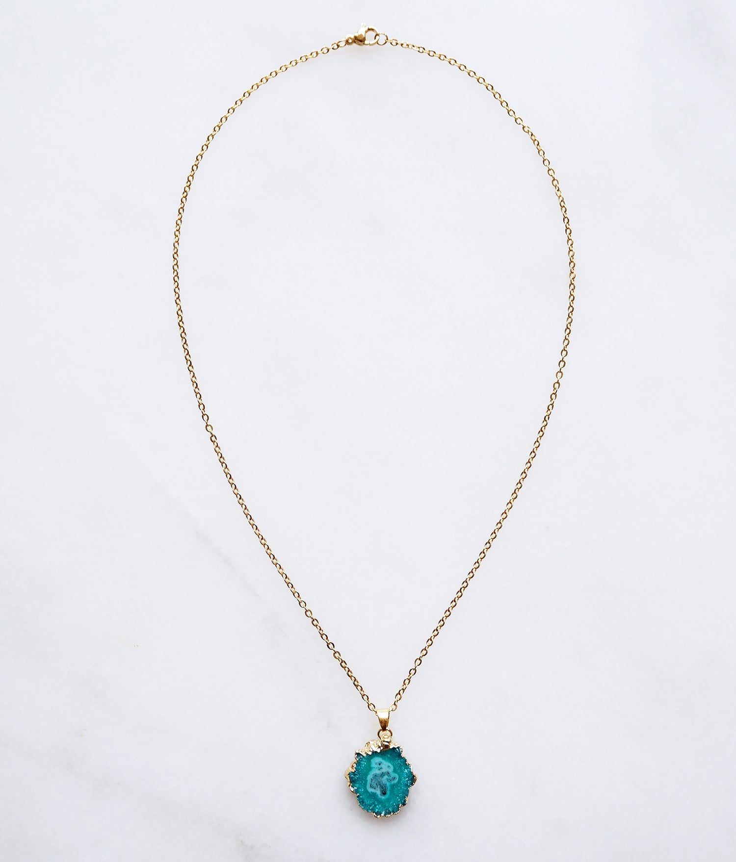 Gold-toned necklace featuring a Turquoise Druzy Agate gemstone pendant.